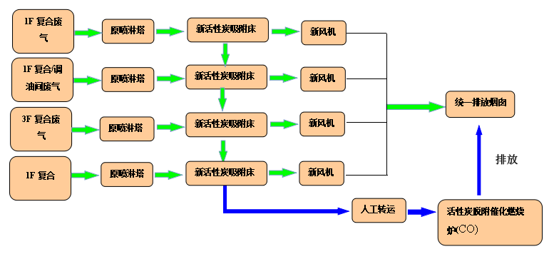 工程中在保留原有的噴淋塔情況下,獨立上新活性炭吸附床,凈化后的廢氣共用煙囪統一排放。吸附飽和的活性炭通過人工轉運到催化燃燒爐進行脫附再生,脫附抽屜和活性炭吸附床設計尺寸吻合,轉運方便。